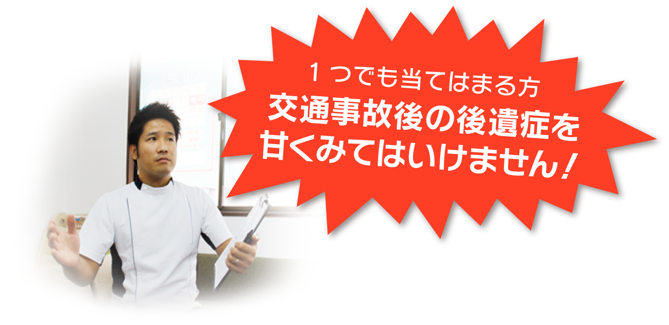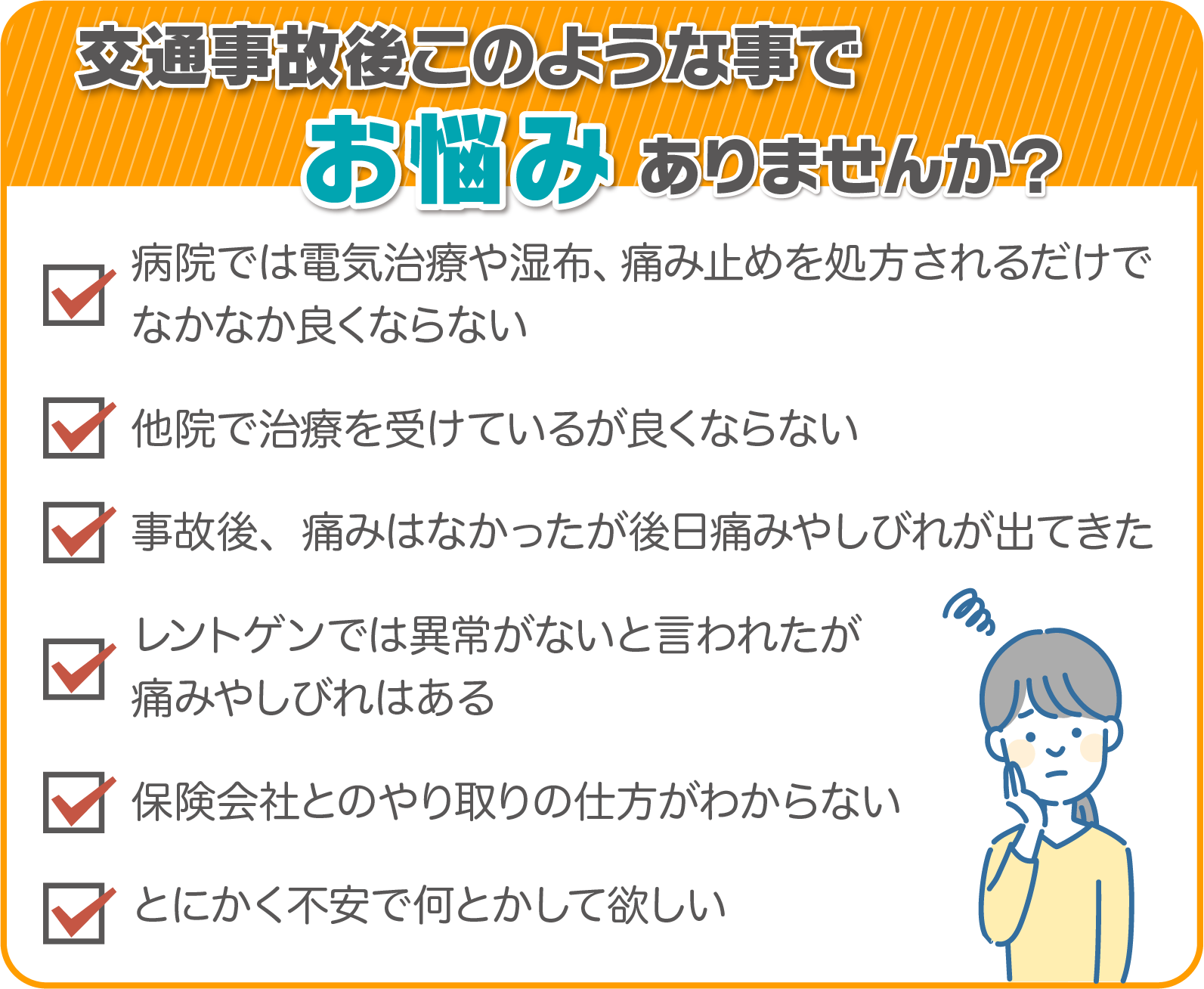 事故にあった恐怖感や運転に対する不安がでてくるのです。だからこそ患者様の痛みと悩みをしっかりとお聞きして、心と体のケアをさせて頂いております。