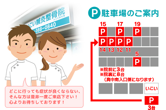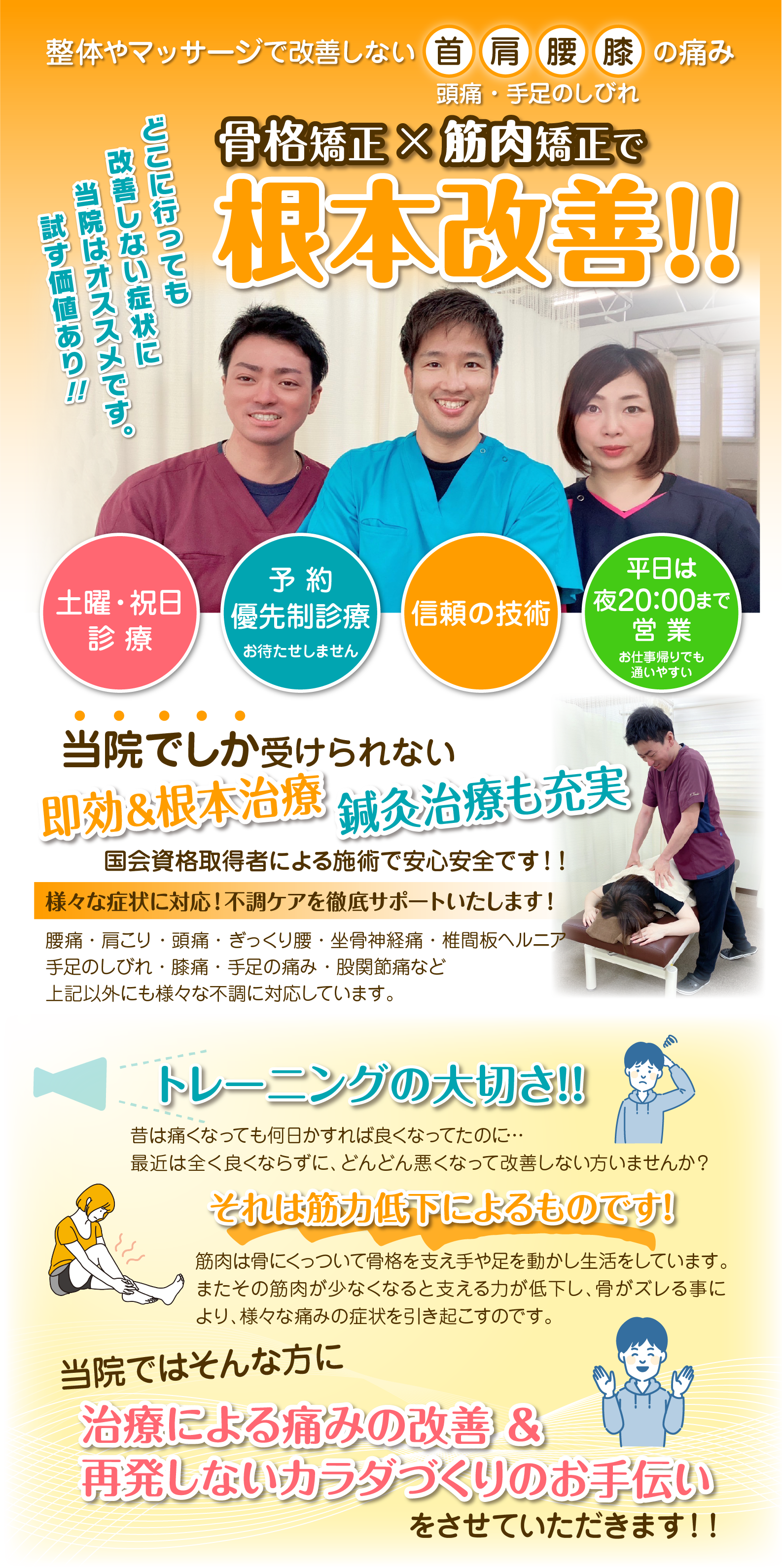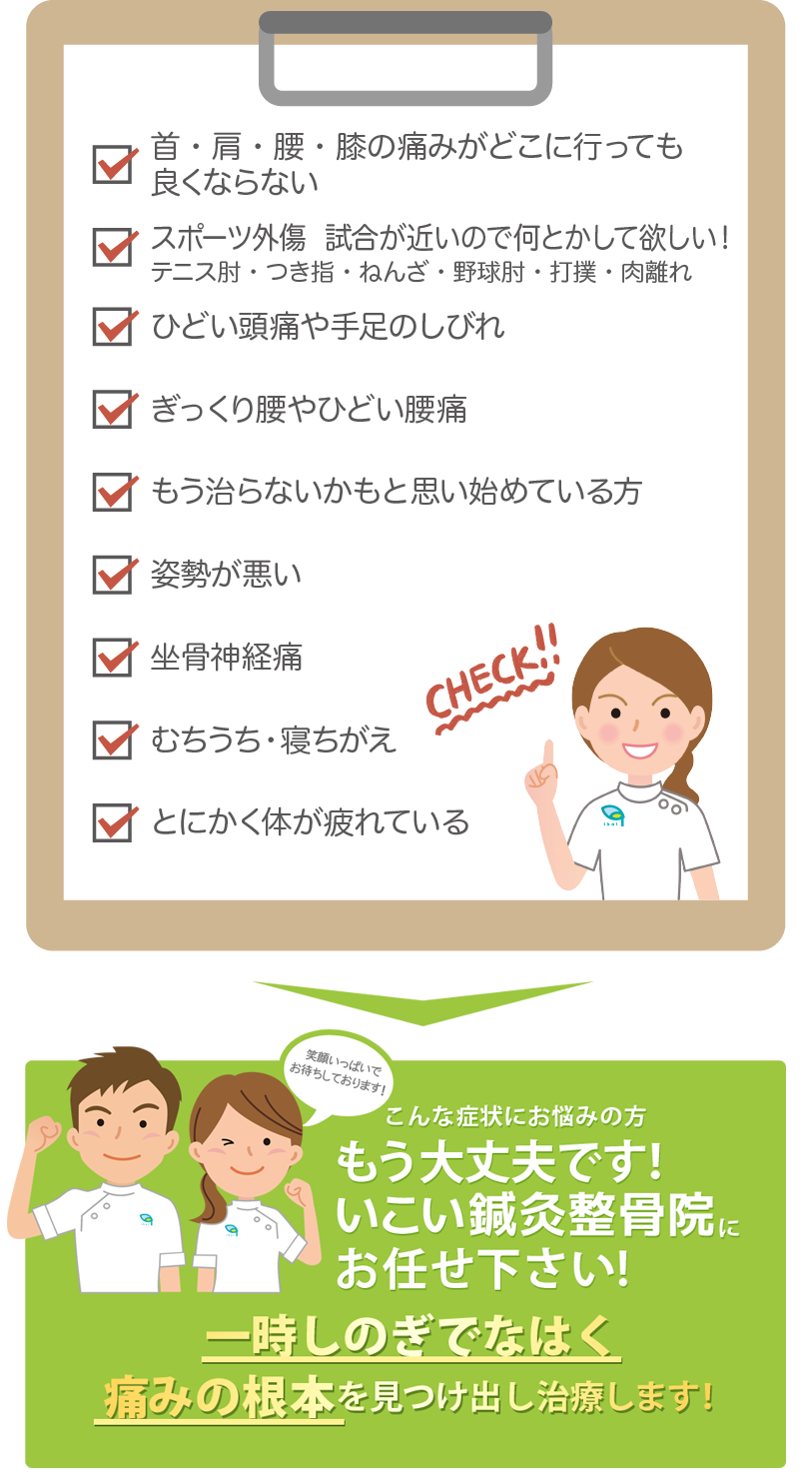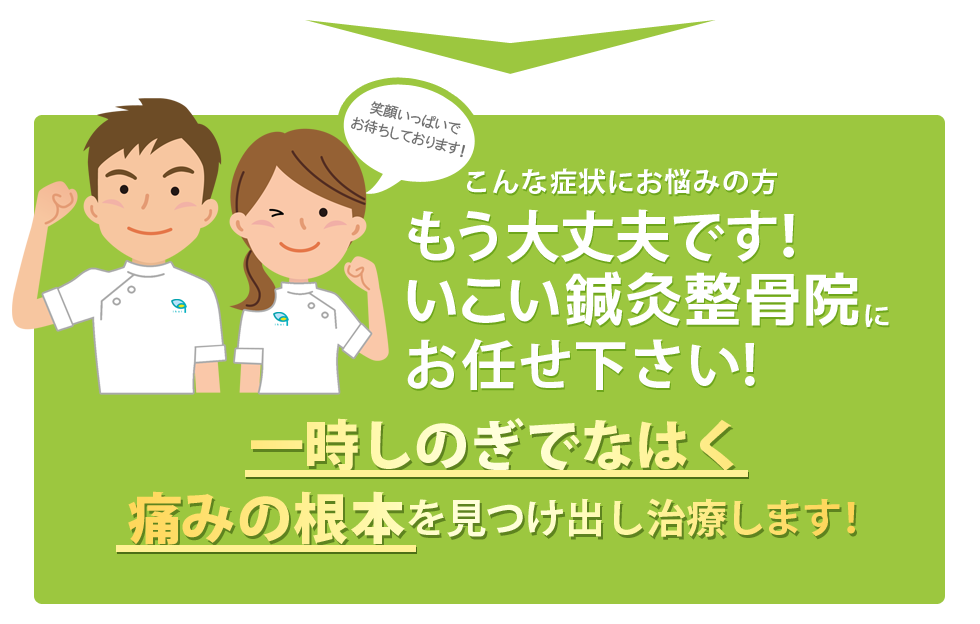 いこいは土曜・祝日も休まず営業しております。仕事が忙しくて平日はなかなか休みの取れない方でも通いやすいく、治療することができます。