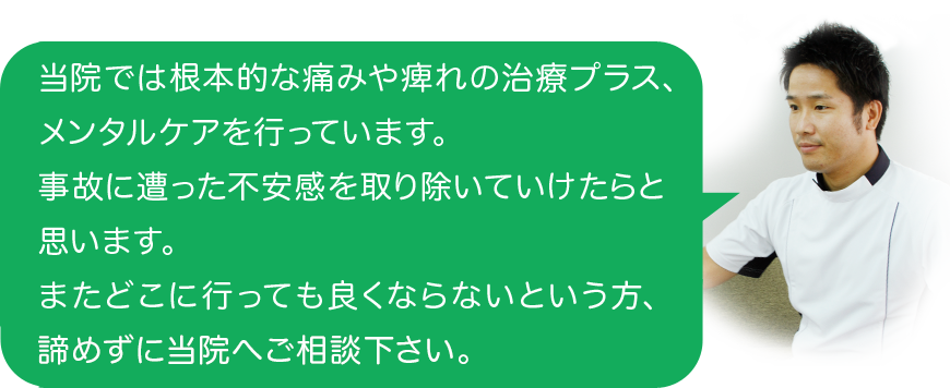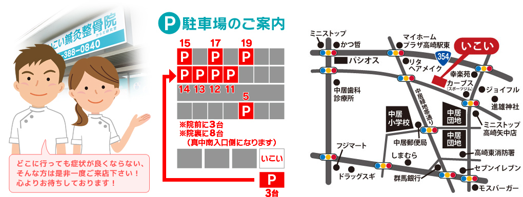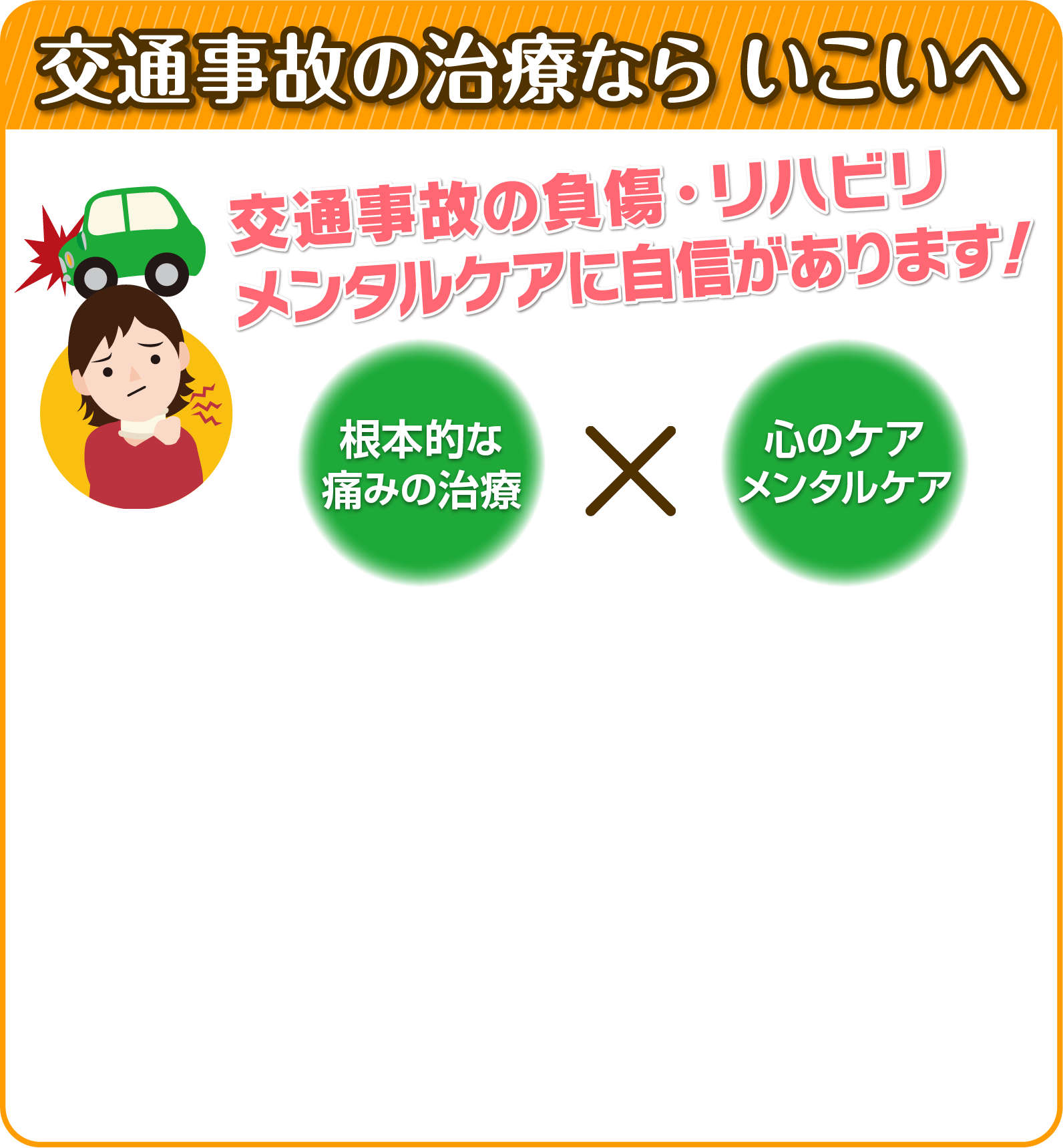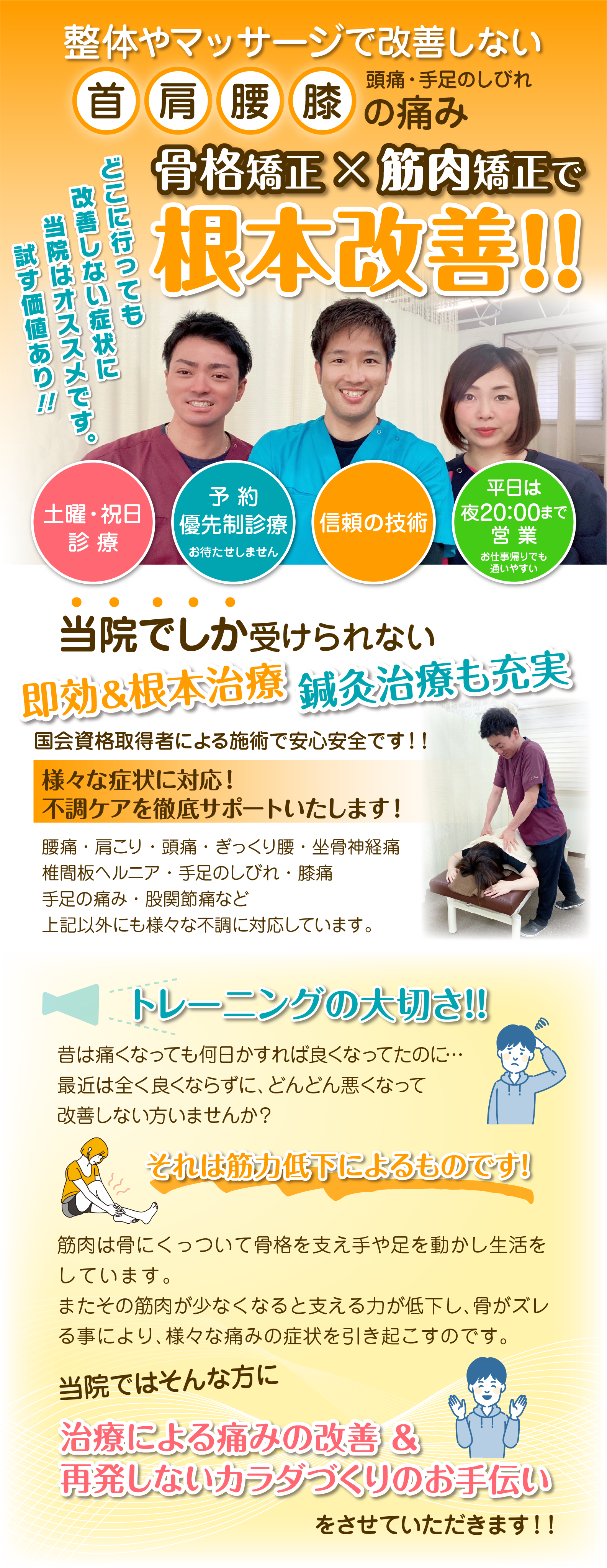 いこいは土曜・祝日も休まず営業しております。仕事が忙しくて平日はなかなか休みの取れない方でも通いやすいく、治療することができます。
