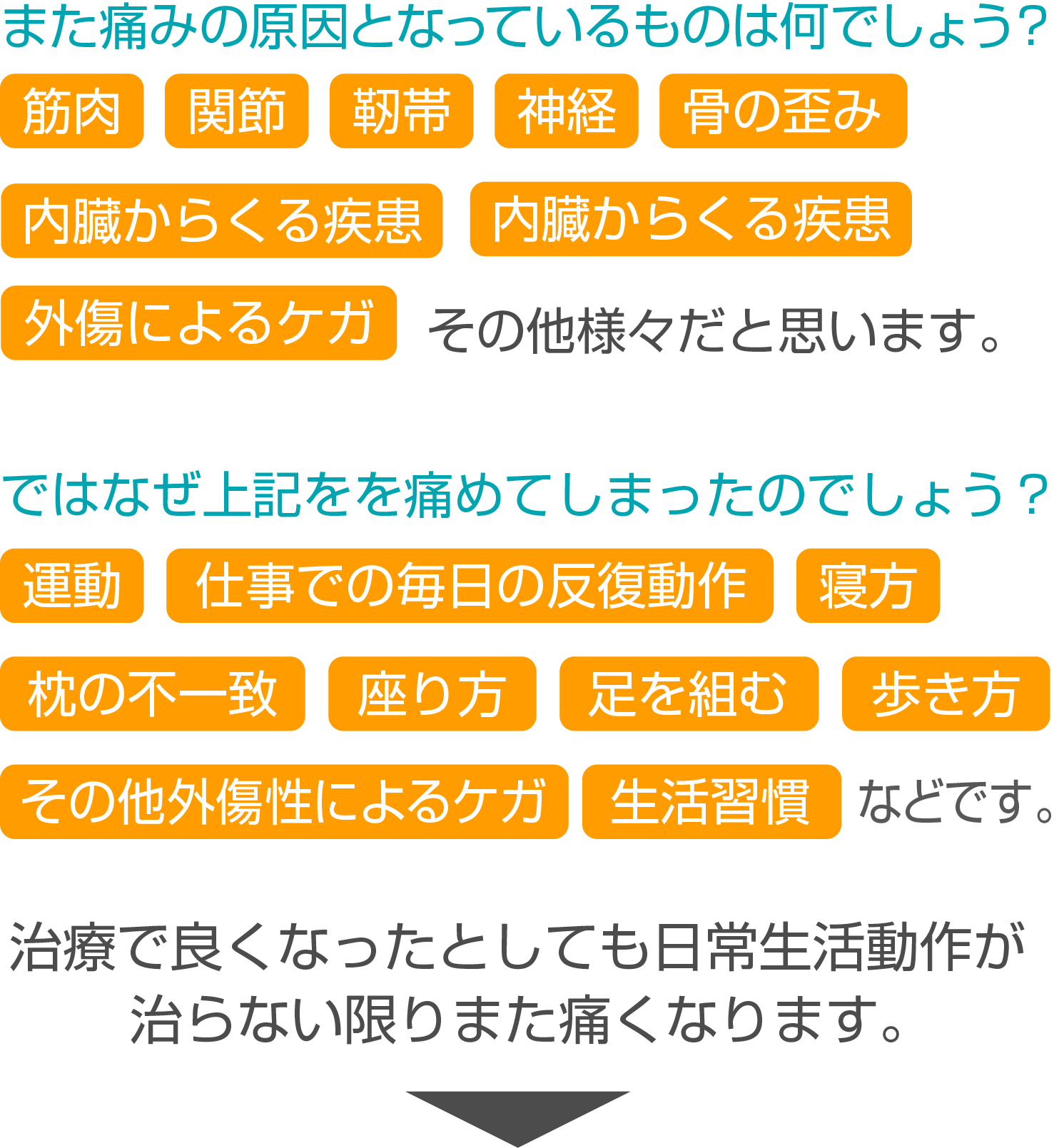 それは根本的になっている痛みの原因が治らない限り、一時的な改善は見られても完治には繋がらないからです。
